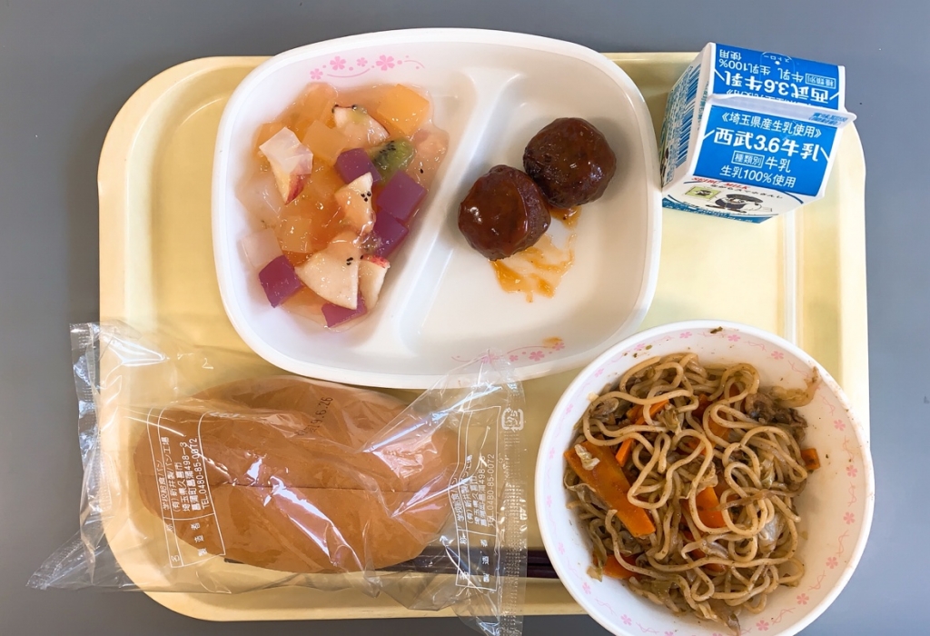 コッペパンスライス・肉団子・あじさいジュレ・焼きそば・牛乳