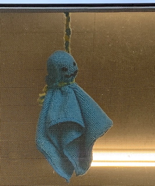 事務室の窓際にてるてる坊主を飾ってみました。がんばれ岡部中☺