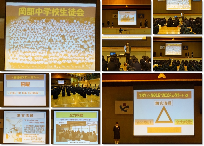 今後の生徒会の活動の方針と岡部中独自の取組である「トライアングルプロジェクト」について、改めて確認するとともに、より一層充実した取組を行っていくための生徒会本部による生徒朝会が行われました。
