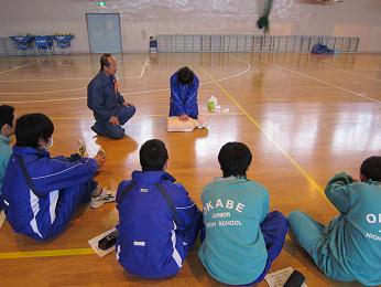 本校では、3.11や学校における様々なケースを想定し、いざというときにも活動できる生徒を育成するため、本年度2年生の全生徒を対象とした救急救命講習を深谷市消防署の方を講師として、講習会を行っています。心肺蘇生やAEDの使用まで含めた講習会です。2時間の講習ですが、どの生徒も集中して学習していました。
