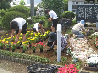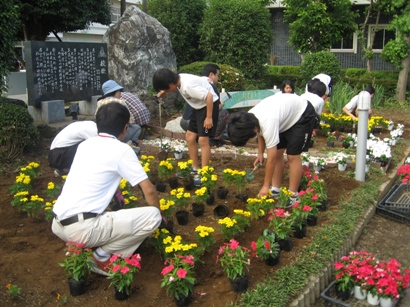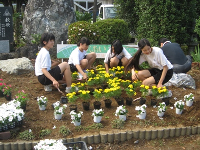花はなプランで新たに花壇に花が植えられました。環境美化委員とラグビー部の生徒と学校応援隊のみなさんの協力で花壇が見違えるようにきれいになりました。