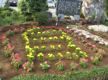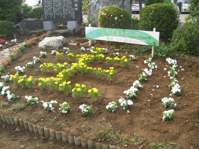 黄色いマリーゴールドで作った「自」「主」の字が読めますか。