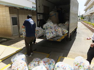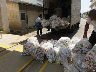 本校のトライアングルプロジェクトの一つ「エコキャップ集め」で集めたペットボトルキャップを本日回収して頂きました。