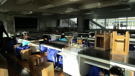 理科室の机に待避する生徒 急いで外へ避難・・・