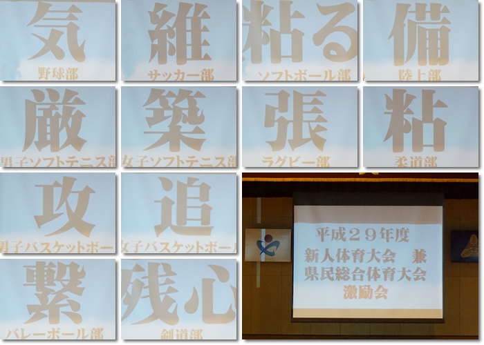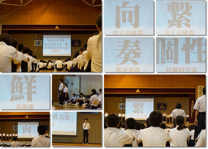 それぞれの部が新人戦や各種コンクールに向けて決意を述べ、その決意を漢字で表しました。新人戦へ向けて最後の追い込みの時期となりました。頑張れ!岡部中!