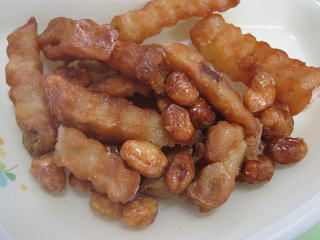 大豆とポテトを油で揚げて、甘いしょうゆだれと