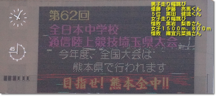 昨日と本日の2日間にわたって、通信陸上の県大会が熊谷スポーツ文化公園陸上競技場で行われています。岡部中からは男子走り幅跳び、女子1500m、女子走り幅跳び幅跳び、女子800mに4名の選手が出場しました。