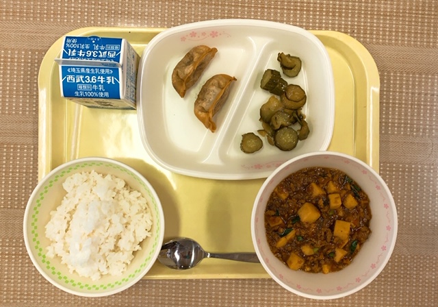 ごはん・揚げ餃子・中華きゅうり・四川風麻婆豆腐・牛乳