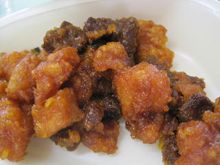 鶏肉と豚レバーを唐揚げにし、カボチャは