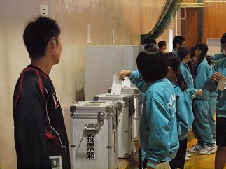 候補者を前に、校長先生の話 投票は、実物と同様、厳正に行われた