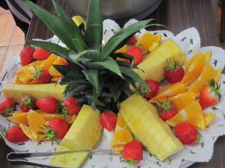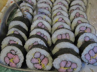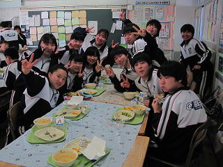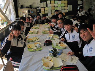 メロンパン 牛乳 コロッケ グリーンサラダ ミネストローネ  今日は3年生のバイキング給食でした。 担任の先生や担任外の先生と楽しく バイキングをしました。 3年生は卒業が間近なので、お祝いの お花寿司を作りました。朝から調理員さんと 心をこめて巻きました。また、ごはんで作る ライスピザや唐揚げ・お魚料理・・・デザートの フルーツ盛り合わせなど種類豊富な給食 でした。小学校から合わせると9年間の食に 関して大切なバイキング給食でした。 好き嫌いなく食べて、栄養の事やマナー・ 様々な勉強ができたと思います。 最後には食べたカロリー計算などしました。   |  |