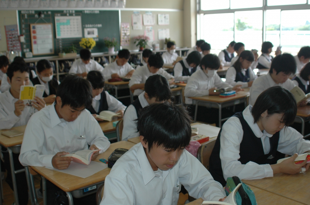 朝の10分間読書 貴重な時間です 本校では、毎朝8:10~8:20の10分間、全校で読書をしています。朝読書は多くの学校で取り組まれている活動で、本に親しむだけではなく1日を落ち着いた雰囲気の中でスタートするねらいもあります。次の4つの原則で行っています。1 みんなでやる 2 毎日やる 3 好きな本でよい 4 ただ読むだけ中学校時代に良い本をたくさん読んで、心を磨いて欲しいと思います。