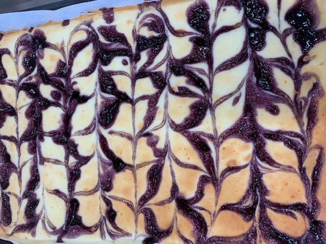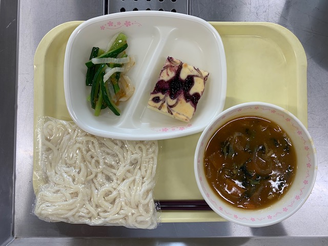 今日の給食は、カレーうどん・ヨーグルトベリーパンケーキ・スティック野菜・牛乳でした。 今日から3年生が修学旅行でいなかったので、給食室にとりにくる生徒も少なく寂しかったです。 ヨーグルトベリーパンケーキには、ヨーグルトと隠し味に粉チーズが入っていました。 生地を鉄板に流し入れ、ブルーベリーソースをかけて一手間かけるとおしゃれなパンケーキに!オーブンを開けると給食室いっぱいに甘い香りがしました。