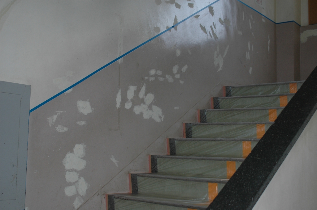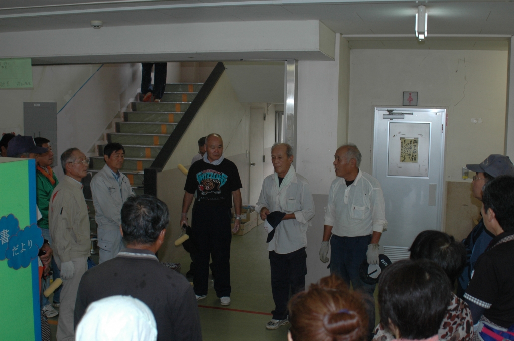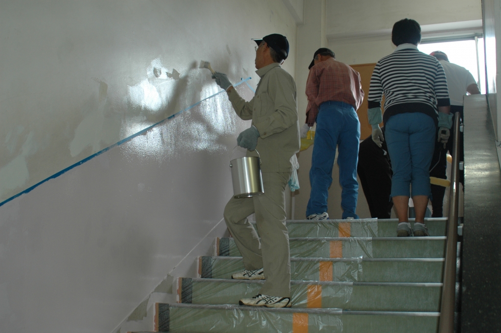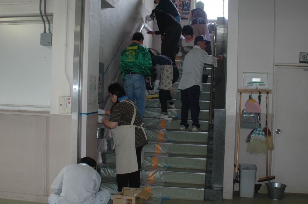 25人の学校応援団のみなさんが、懸案であった階段の壁の塗装を