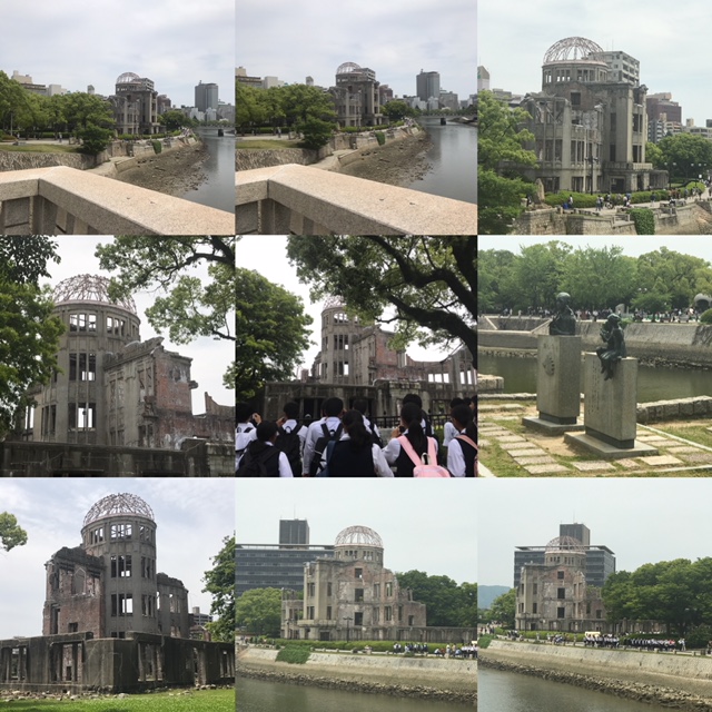 修学旅行説明会の日に開催した被爆者伝承事業でも話のあった、原爆ドームを間近で見学し、対岸に渡りクラス写真を撮影しました。