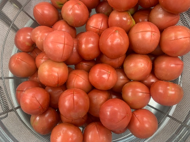 ぺろりと皮がむけます。こうすることで、形がきれいに残ったまま切ることができます。今日はスープなので、食べた時に口に皮が残らないように丁寧にとってもらいました。