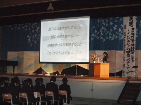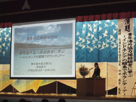 11月2日の『JICA国際協力出前授業』ではJICA海外協力青年隊派遣員の和田尚子さんを迎え、インドネシアでの経験を講演してもらいました。
