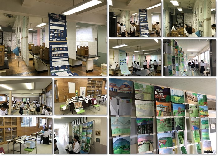 夏休み中に岡中生の皆さんが取り組んでくれた、絵画、発明創意工夫作品、理科の自由研究など、校内に展示されています。本日は、各学年でその展示を鑑賞しました。
