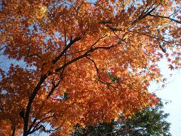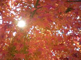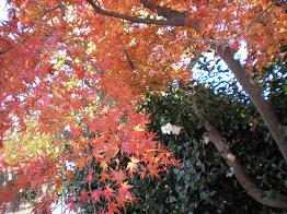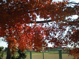 中庭のもみじ、夕陽に照らされて もみじ越しに埼玉工業大学を望む