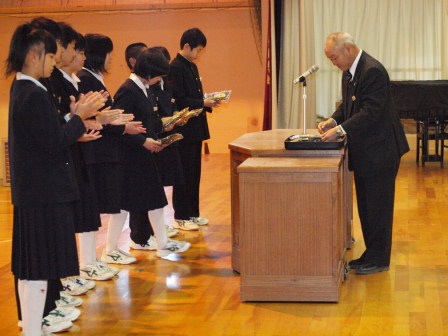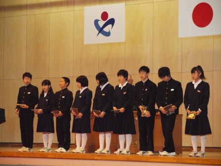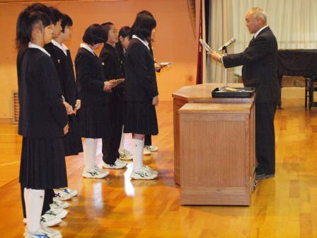 岡部中学校の特徴であるトライアングルプロジェクトを支えてきた旧生徒会の功績を称えるとともに盾を授与しました。