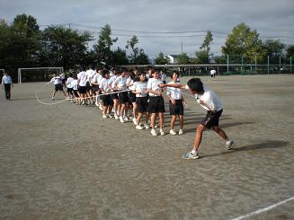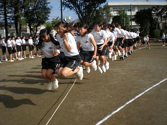 どのクラスもみんなでジャンプの練習しています。だが、まともに跳べているクラスは少ない。これが、どのように変身するのでしょうか。楽しみですね。そこで、はやくも12回跳んだという1年2組の直井監督に聞いてみたところ、「まだまだ、これから」と言っていました。ますます楽しみですね。