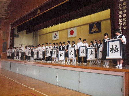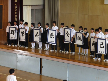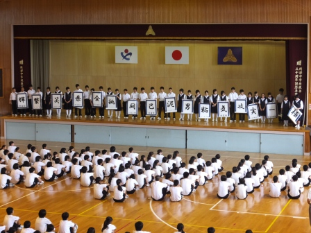 学校総合体育大会にむけて、意気込みを漢字一文字で表し、決意を表明してくれました。どの部もいい結果がでるよう頑張ってください!!