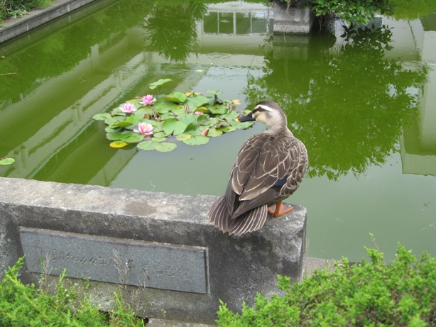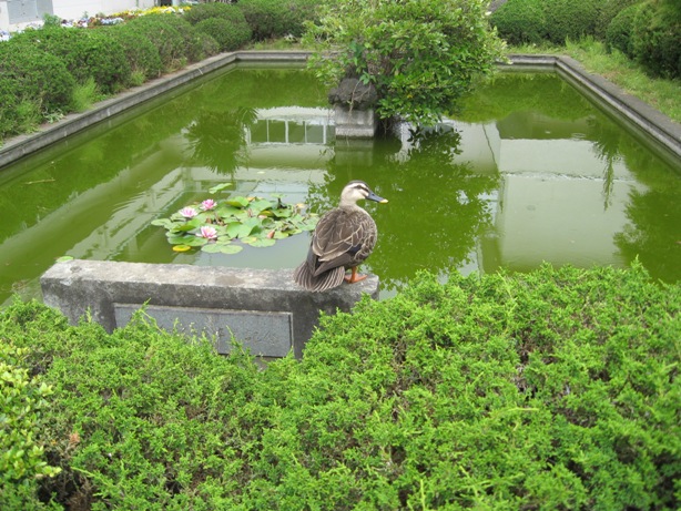 岡部中学校の中庭にある池にスイレンの花が咲きました。しかも、2週間ほど前から鴨が2羽やってくるようになりました。今日はあいにく1羽しかいませんでしたが、植物と動物に癒されます。