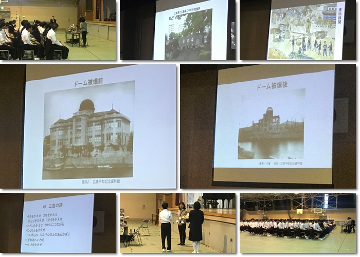 講演では、原爆投下時の被爆体験者の生々しい実体験を伝承いただくとともに、被爆による差別などについてもお話をいただきました。70余年の復興の歴史や、広島の方々が世界の平和を願う熱い想いなどを感じることができたと思います。不自由なく生活することのできる今の世の中を当たり前と思わず、校歌にもある「平和」について、深く考えさせられる時間となりました。