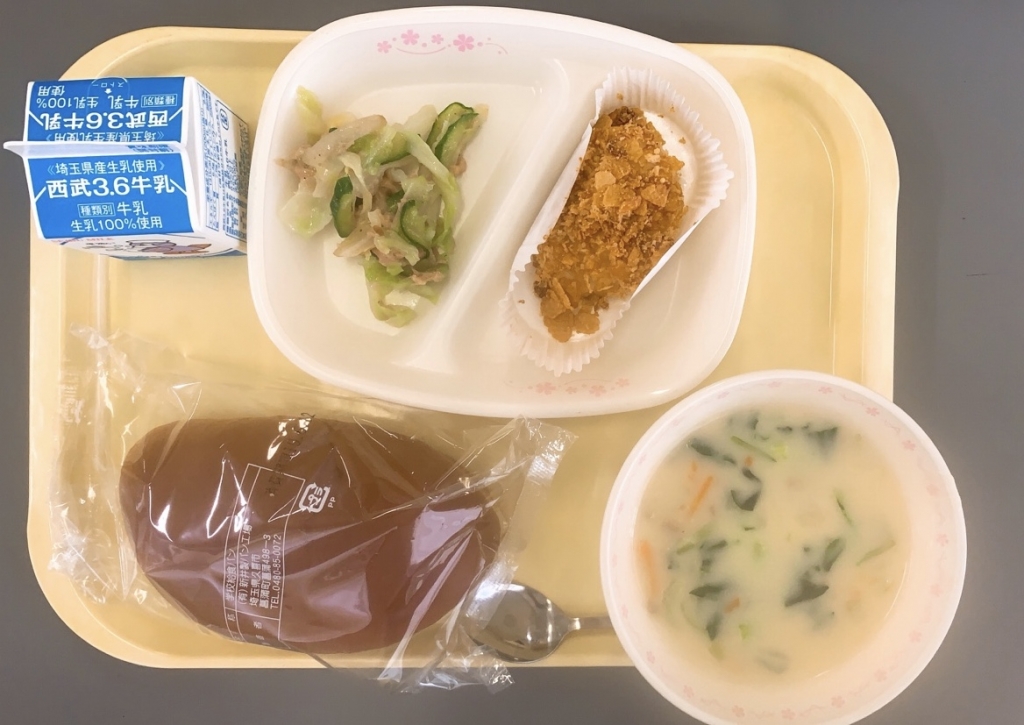 今日の給食は、黒パン・チキンのフレーク焼き・ヘルシーサラダ・チンゲン菜のクリームスープ・牛乳でした。 チキンのフレーク焼きは生徒にも人気で家庭でもできるメニューですので、レシピを載せておきます♪ 【今日の埼玉県産】黒パン・牛乳 【今日の深谷市産】キャベツ・きゅうり・にんじん