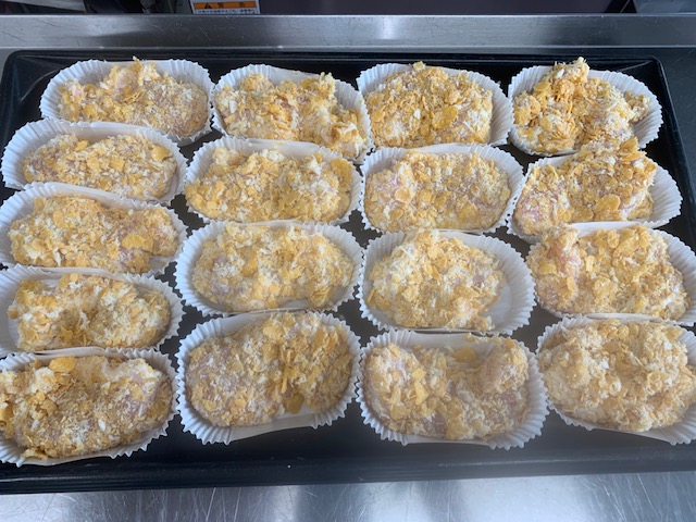 【作り方】 1.コーンフレークを手でよく砕いて、パン粉、粉チーズを混ぜておきます。 2.マヨネーズを塩こしょうした鶏肉の全体によくつける。30分以上つけ込みます。 3.2の鶏肉に1の衣を押しつける様につけます。 4.天板に並べて、200度に温めたオーブンで20分焼きます。 ※鶏肉にマヨネーズをつけることで、肉が軟らかくなり味がしみて美味しいです。マヨネーズの味はあまり感じません。サクサクとした食感が楽しめます。 |  |