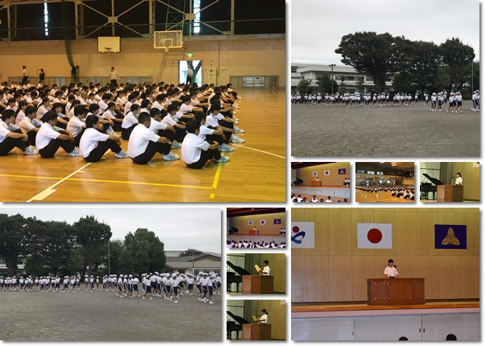 さすが岡中生です。少しだけ涼しいとは言え、まだまだ暑い日が続き、2学期始業式も暑い中でしたが、制服で始業式を行うことができました。各学年の代表からは、2学期や今後の学校生活、卒業まで見据えた素晴らしい2学期への意気込みが発表されました。避難訓練も実施しました。
