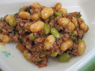 豚挽き肉を炒め、大豆や枝豆・ベーコンを加え