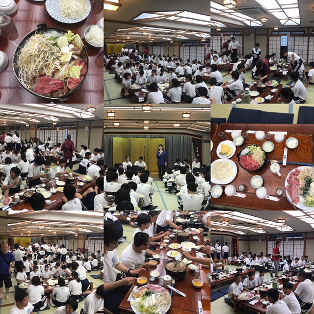 班別自主見学から宿に帰ってきて、みんなで元気に夕食です。すき焼きでしたが、量も多く食べきれなかった人もいたようです。