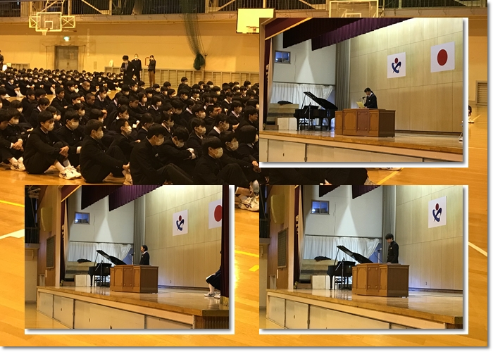 平成30年がスタートしました。学校では3学期の始業式で、岡中生のみなさんの元気な顔を見ることができ、安心しています。体調不良でお休みしている人もいますが、早く元気になって登校してください。待っています。