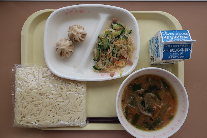 今日の給食は、ごま味噌ラーメン・牛乳・ネギみそパオズ・春雨サラダでした。