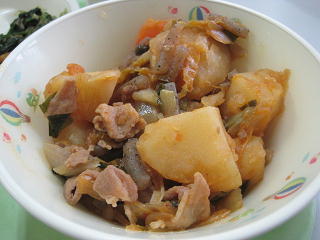 今日は肉じゃがにキムチを加えた
