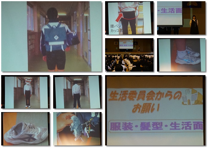 本日は生徒朝会(生活委員会)が行われ、服装・髪型・生活について生活委員会から生徒の皆さんへお願いがありました。誰もが気持ちよく中学生らしく岡部中学校で過ごすためのお願いですので、一人一人がしっかりと守って欲しいと思います。